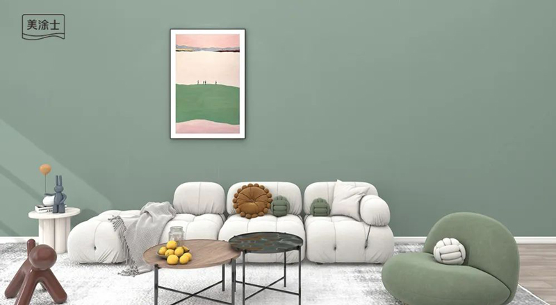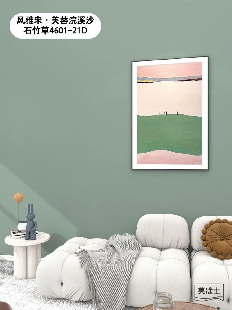 OETY欧亿国潮色天鹅绒苔藓绿MTR038,淡淡的复古绿色在流连的光影中波光琉璃,搭配纯色软装,以及亮色门框,一深一浅,一明一暗,增强了空间的和谐度。亮金色装饰架作为空间中的点缀色,营造出奢而不俗的现代典雅氛围感。