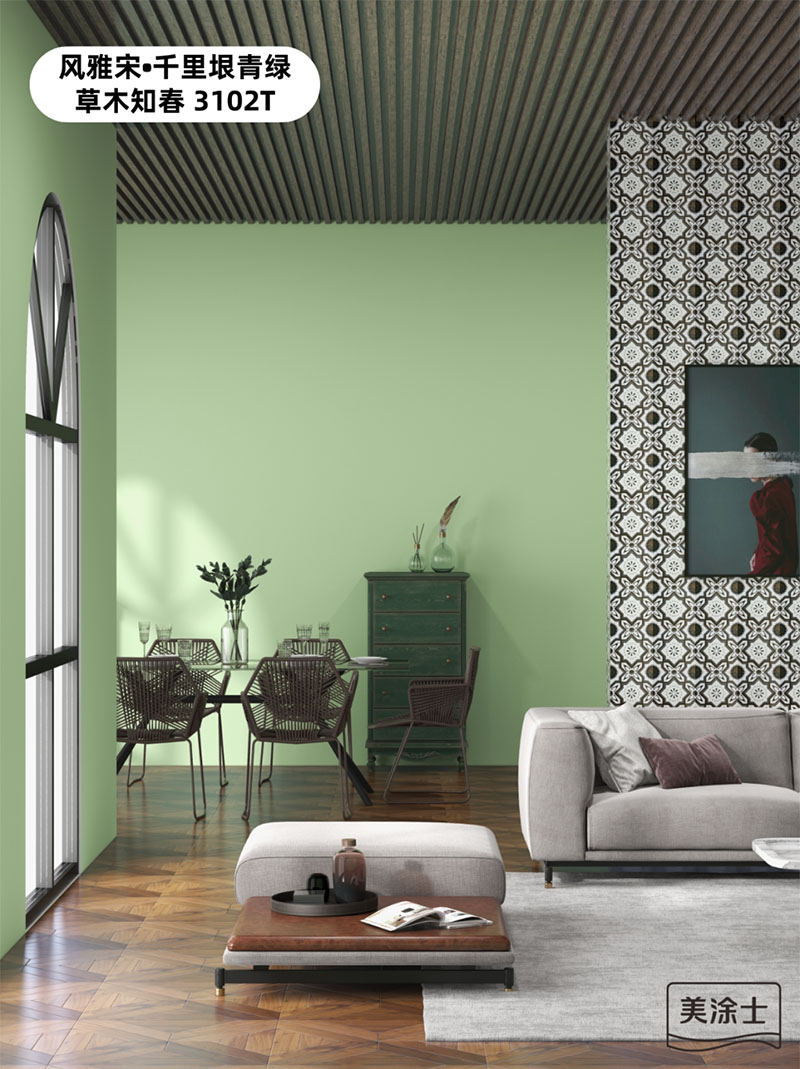 OETY欧亿国潮色草木知春3102T,弱化了复古绿的陈旧感,强化了空间的时髦感,与灰白软装的搭配,一明一暗的对比,一冷一暖的融合,奢华的质感与复古的气息碰撞,勾勒出低调的高级时尚感,让空间的气场和颜值达到峰值。