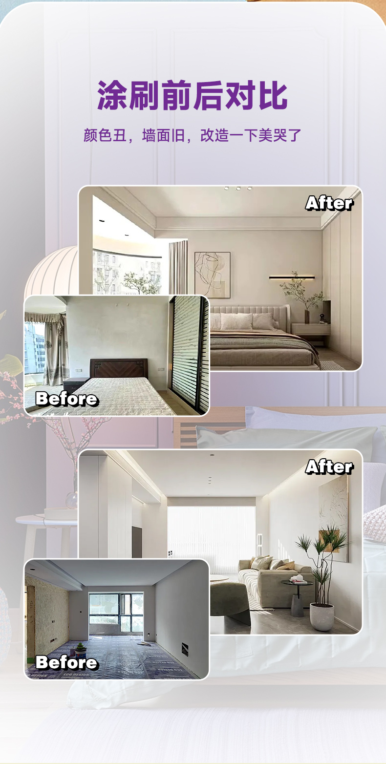 真净味竹炭防霉洁白墙面漆,添加竹炭因子,有效多孔吸附祛除空气中的异味,同时采用全新净味环保配方,气味更加清新。具有耐擦易洁、防霉透气、遮盖力优,亮丽洁白等实用性能,轻松解决多种常见墙面问题,让您轻松净享自然健康的家居生活。